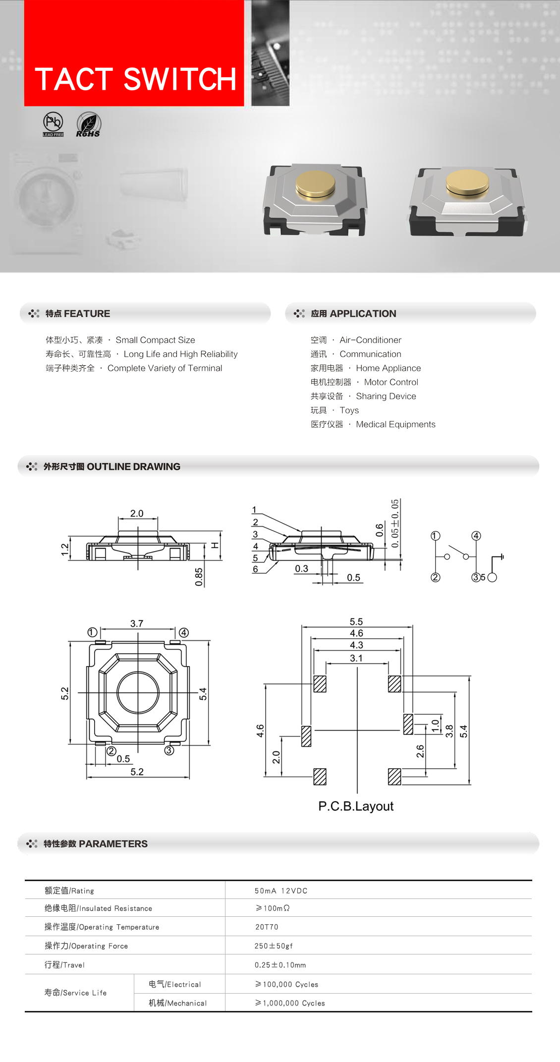 5.2*5.2系列 5.2mm方形轻触开关 带接地翘脚贴片式微型按键开关