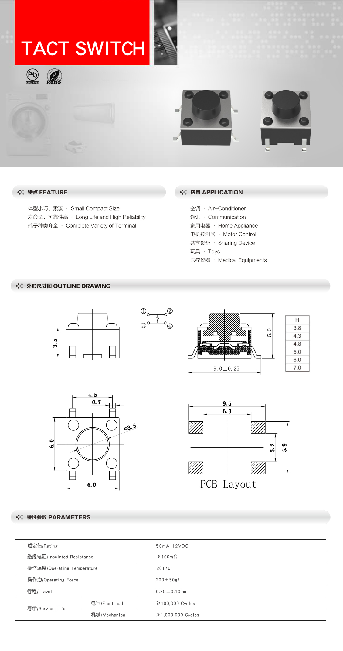 6*6系列 6.mm轻触开关 平脚贴片式微型按键开关