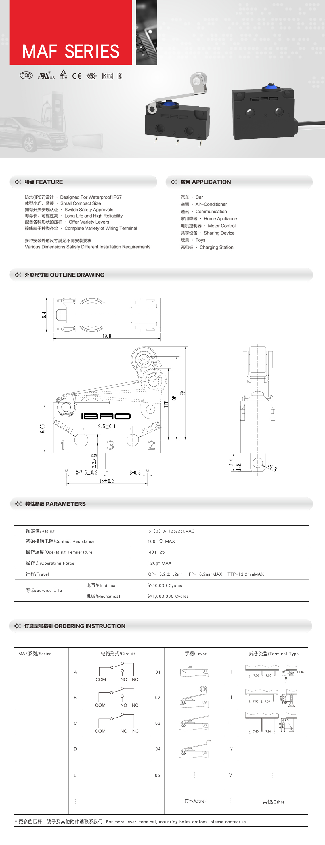 MAF系列 防水微动开关 Ⅰ型外壳 可焊线包塑