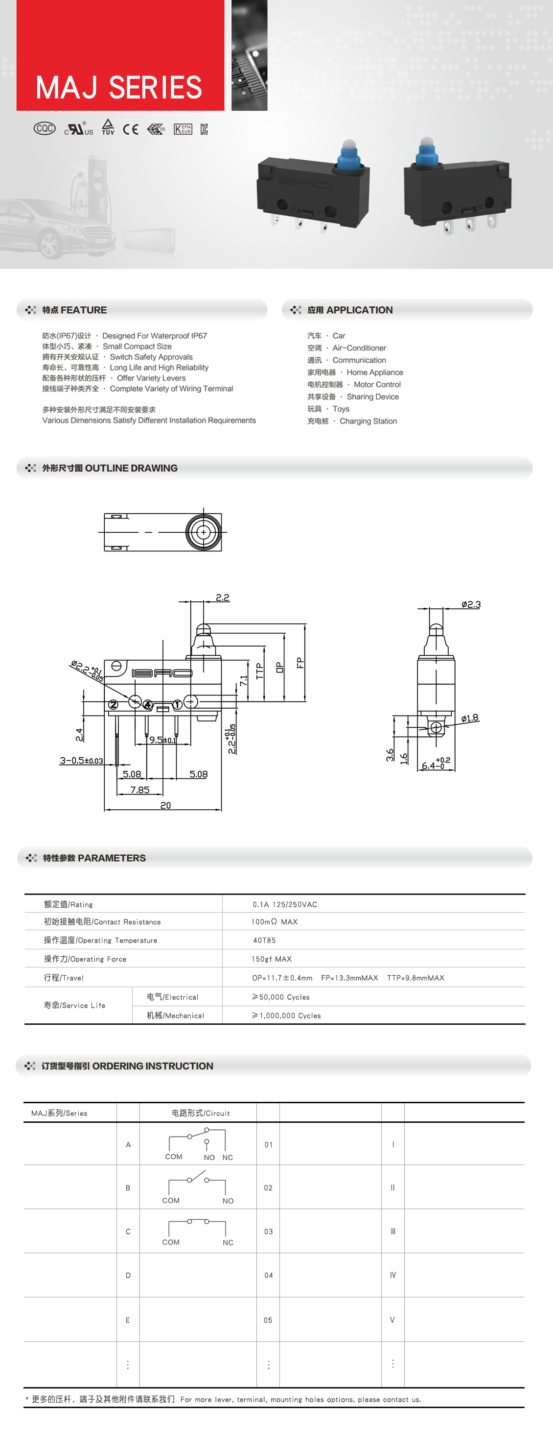 MAJ系列 防水微动开关 单开关新品 可焊线包塑