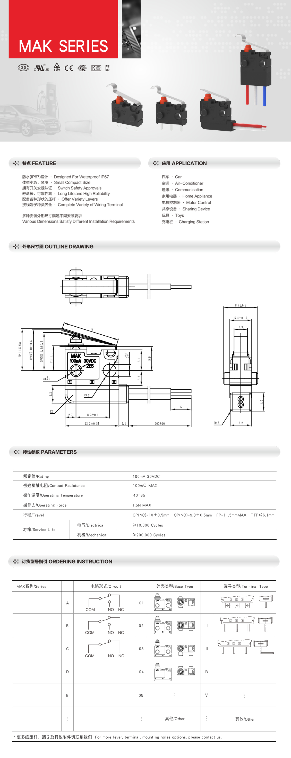 MAK系列 防水微动开关 Ⅱ型外壳 可焊线包塑