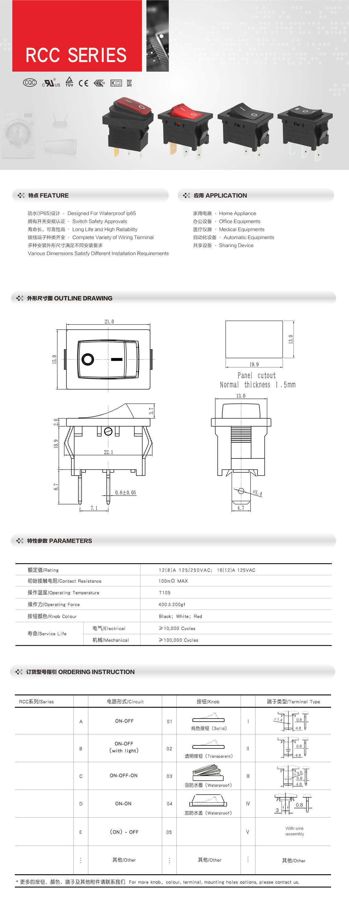 RCC系列 船型开关 方形翘板开关KCD1 2档/3档/复位/带灯