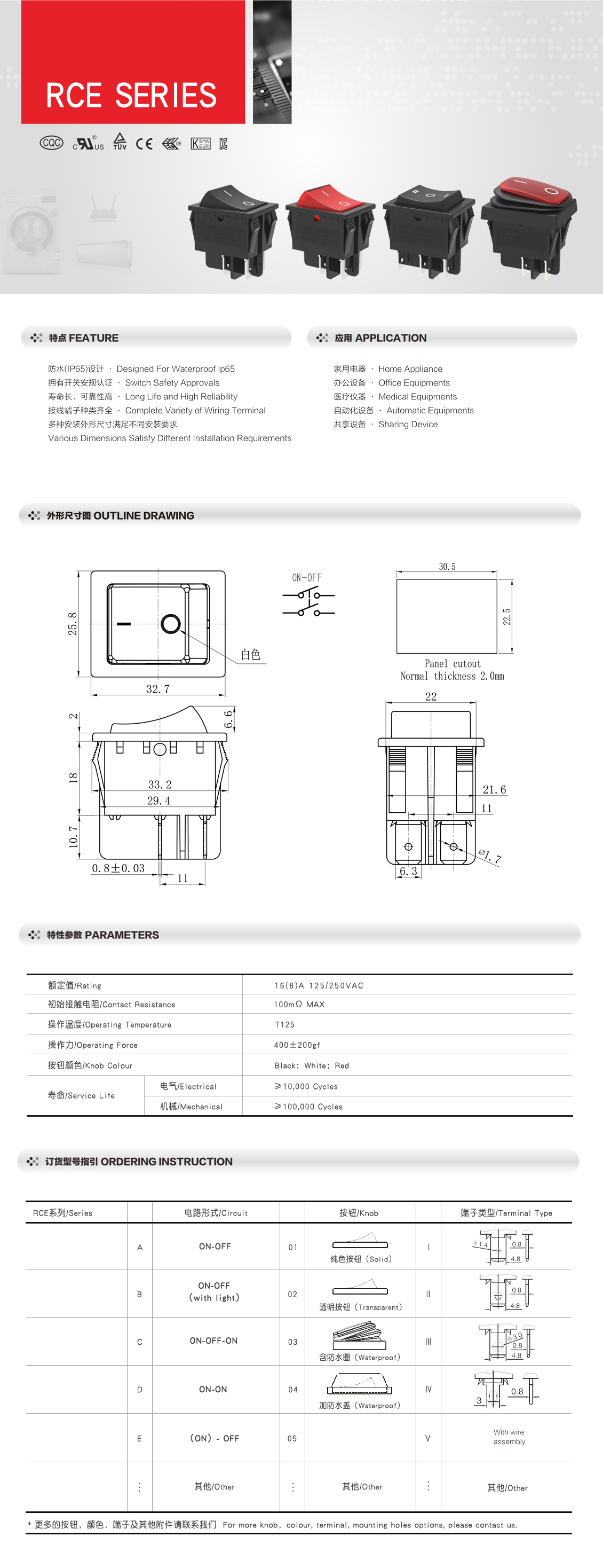 RCE系列 船型开关 方形翘板开关KCD4 双刀双掷可带灯