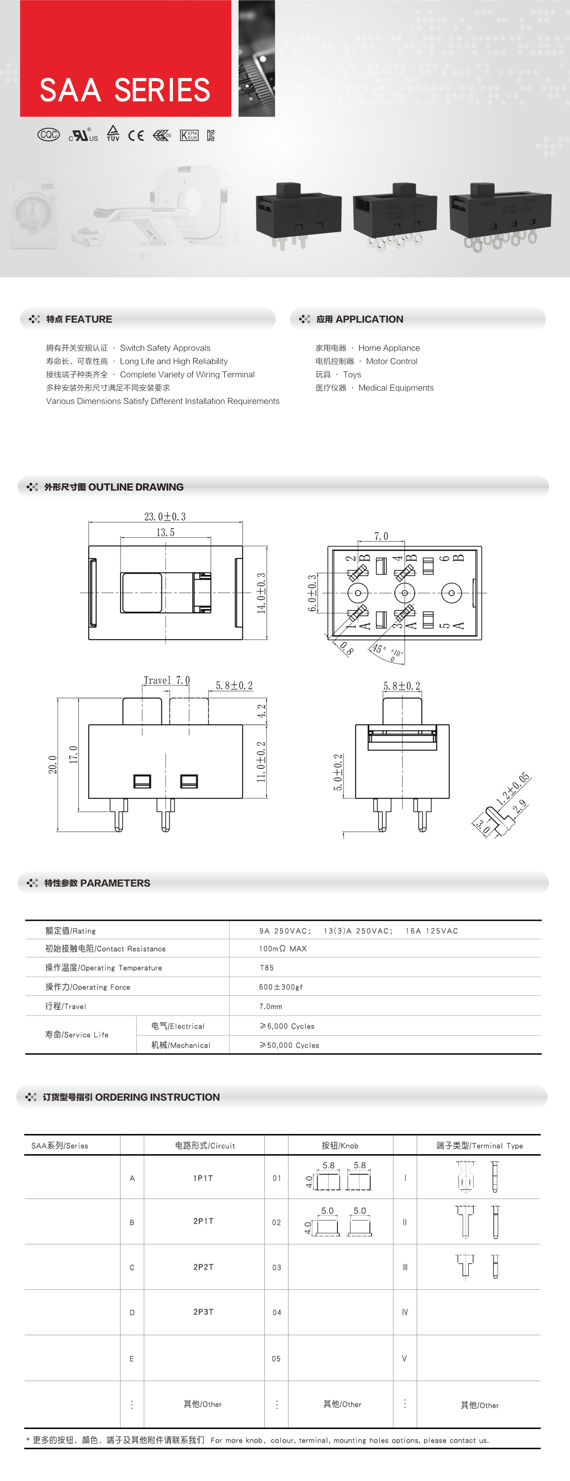 SAA系列 拨动开关 6脚二档塑料滑动开关