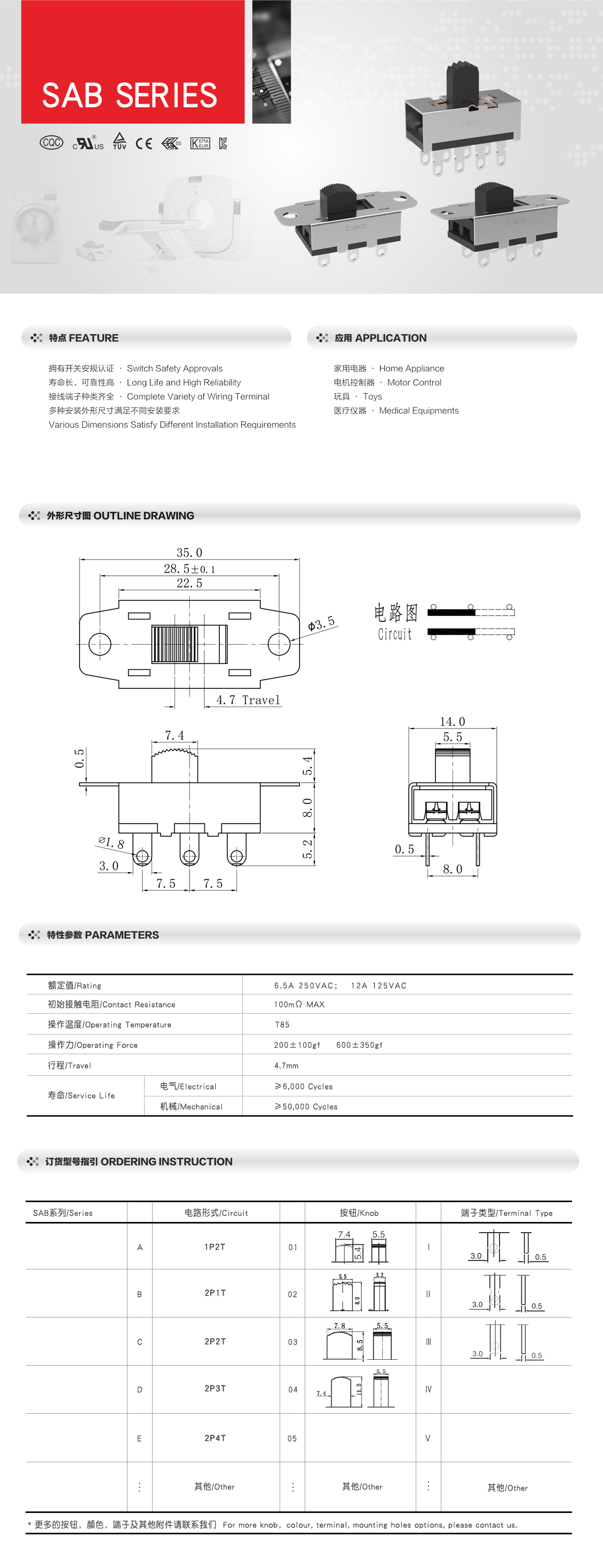 SAB系列 2档拨动开关 3脚单极双位滑动开关