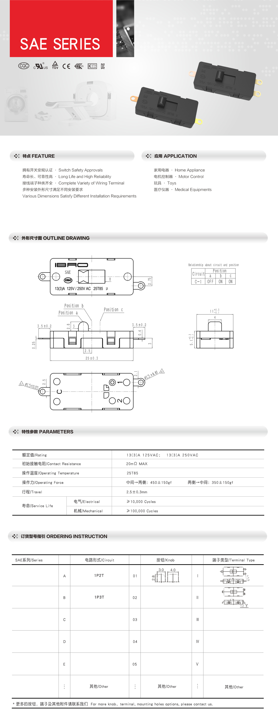 SAE系列 2脚1P2T塑料滑动开关 吹风机拨动开关