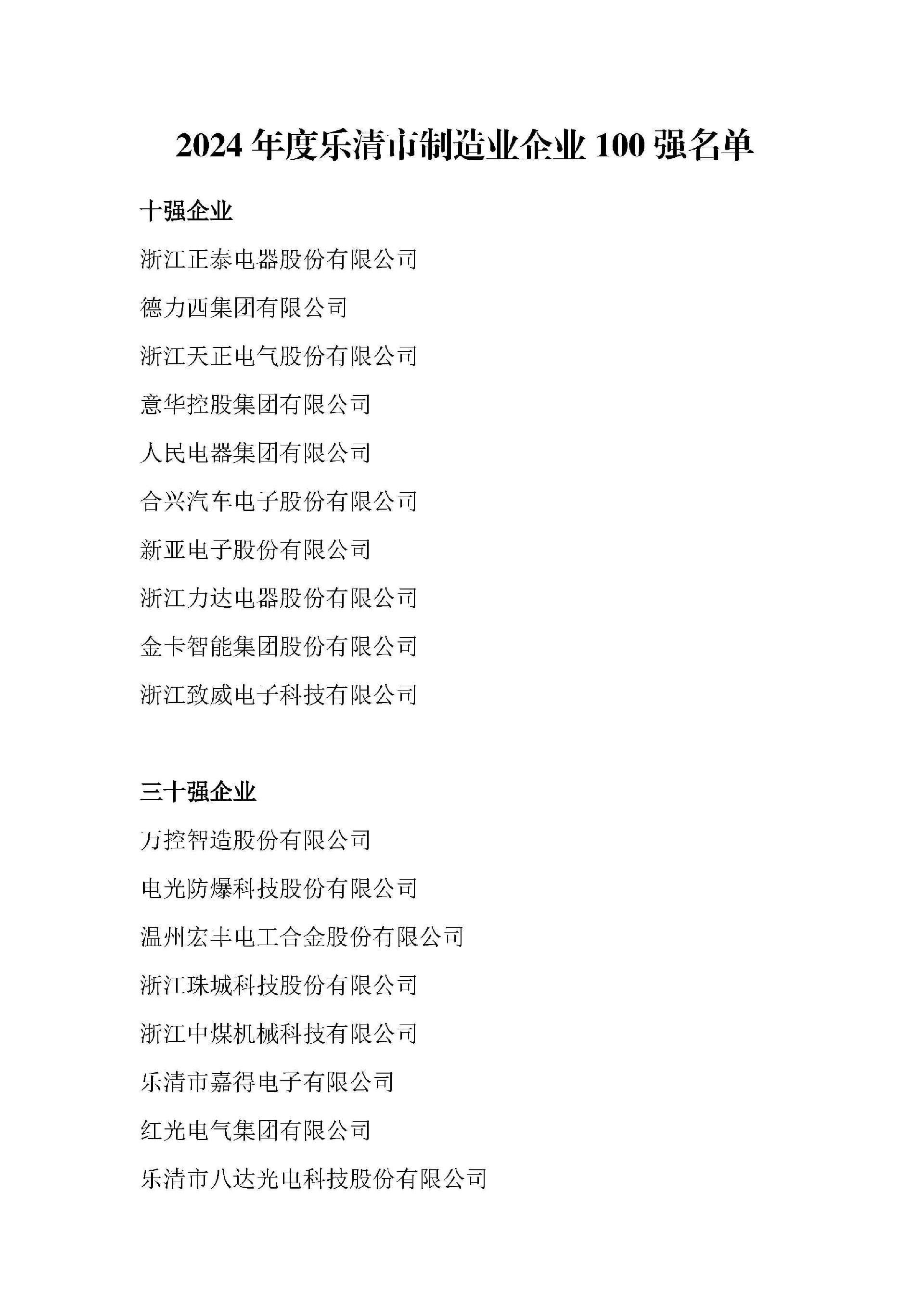 2024年度乐清市制造业企业100强评选结果